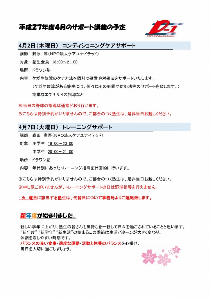 平成27年度4月サポート講義のお知らせ★